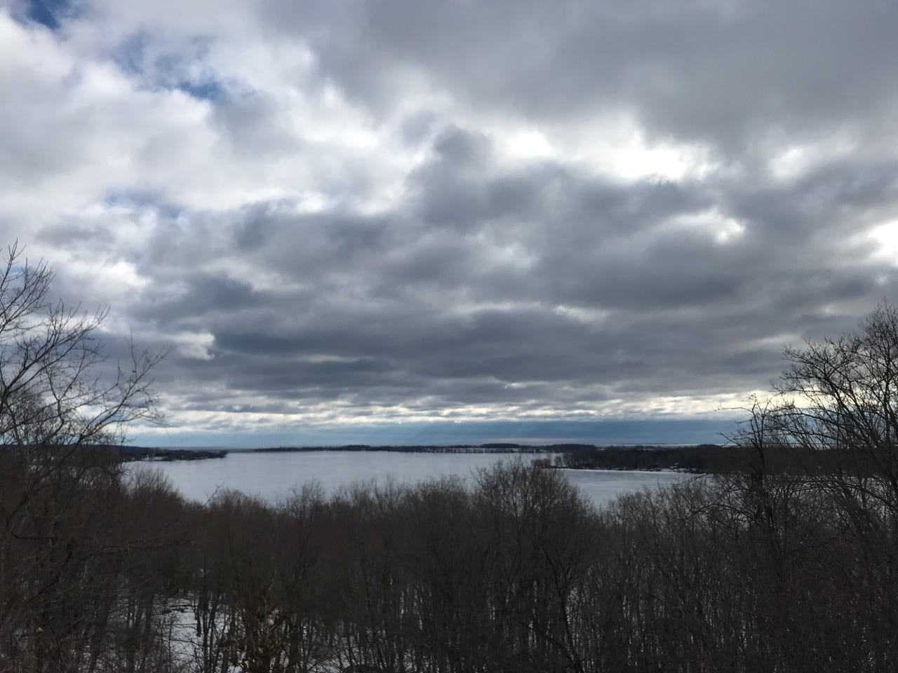 It is a cold morning with a wind at our back. This is the view at our destination this morning, looking southeast over Smith Bay and Waupoos Island across Lake Ontario. On the winter's coldest days I swear if I squint hard enough I can see the blue skies over the Caribbean and that island in the sun, Barbados, just there off in the distance to the right side of the photo, just beyond the darkest bit of sky. Can you see it? Even so it would take a plane to get there.