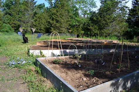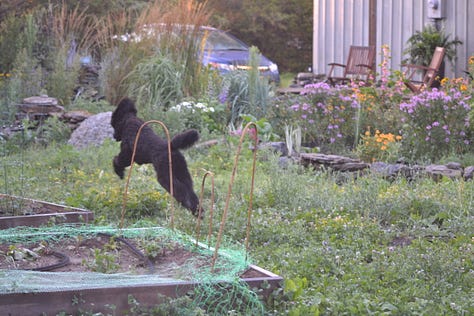 So I built the poodle yard and one day, somehow off leash between the house and the yard he ran top speed, missing the entrance, bounding and bouncing into and then off of the surrounding chicken wire, leaving his poodle imprint, comically like Wile E. Coyote chasing the Road Runner. On another dash across the garden he collapsed in a yelping ball. He had banged his knee on the wood barrier of the freshly built raised bed. Some coddling and cuddling and he was back in action.