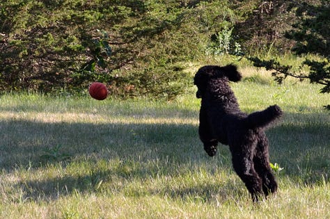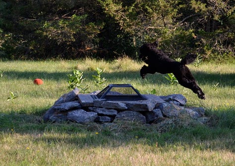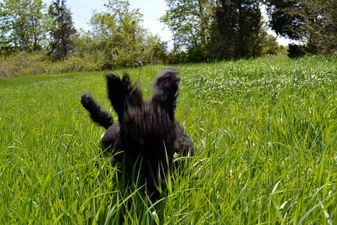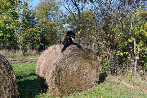 I set about building an enclosed “poodle yard’ for Hugo. I knew no matter how obedient or willing to be by my side he might be, that the population of bunnies and squirrels were itching to lead him astray and perish the thought, onto our country road. The rabbits had a diabolical habit of waiting at the end of the driveway and then dashing across the road. I had heard that so many pets who seem to just follow in their proud owners’ shadows, leashless, eventually are distracted by a dashing fox, squirrel or rabbit, at the wrong time, and that’s it.