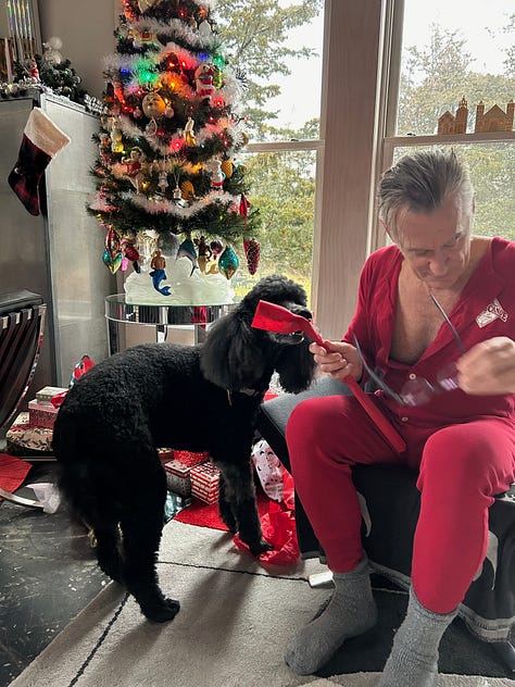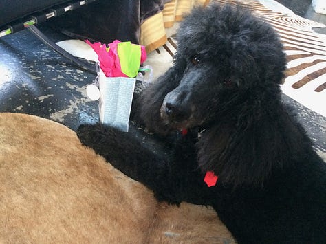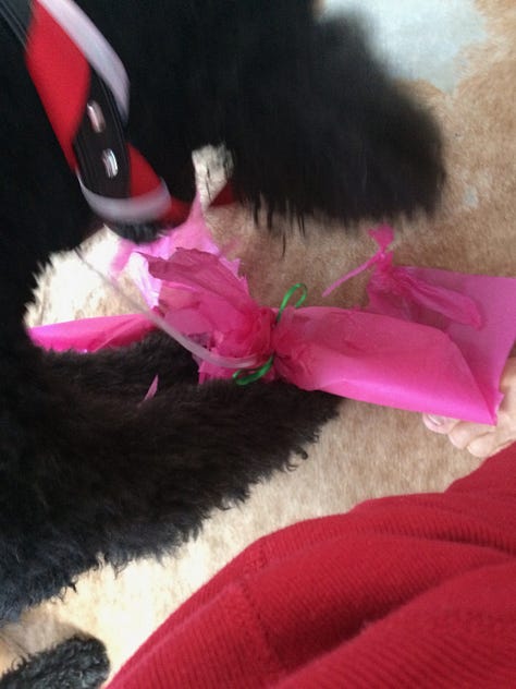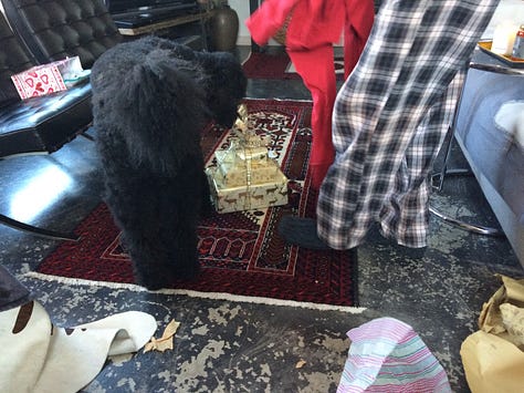 The unwrapping process usually starts with a heavy chin pressing onto your arm with two very sadly seductive eyes looking up under his bangs to indicate that you won’t be unwrapping that gift alone. Will you? You might need a little help. The next step might be a careful nibble at the tissue, following your lead of course, or a pull at the ribbon. From there you must pretty quickly give over control to the poodle whose snout searches for the best way into the wrapping, and soon the occasion, whether a milestone birthday or just Amazon delivering your exercise bands, is about the unwrapping, not about the gift.