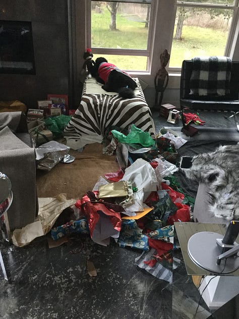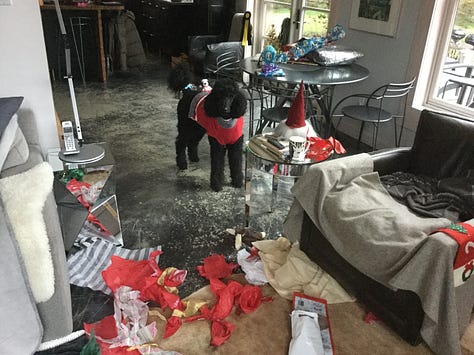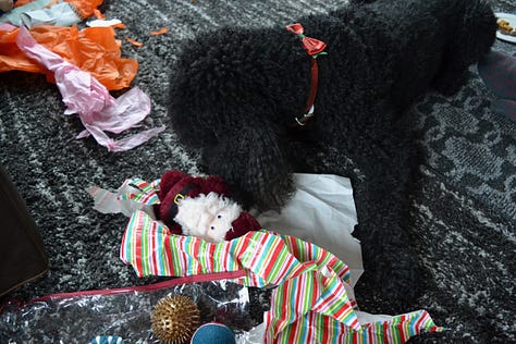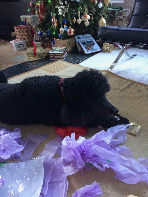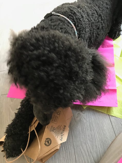 Gift giving times like birthdays and Christmas are imbued with a sense of occasion, and when you have a poodle, there is a massive amount of help in the unwrapping department. Gifts are bought with the sole purpose to watch what the poodle will do. It feeds the economy and yes, the recycling bin. I try to balance this out in other ways––being a vegan, working from home, growing my own vegetables, power napping.
